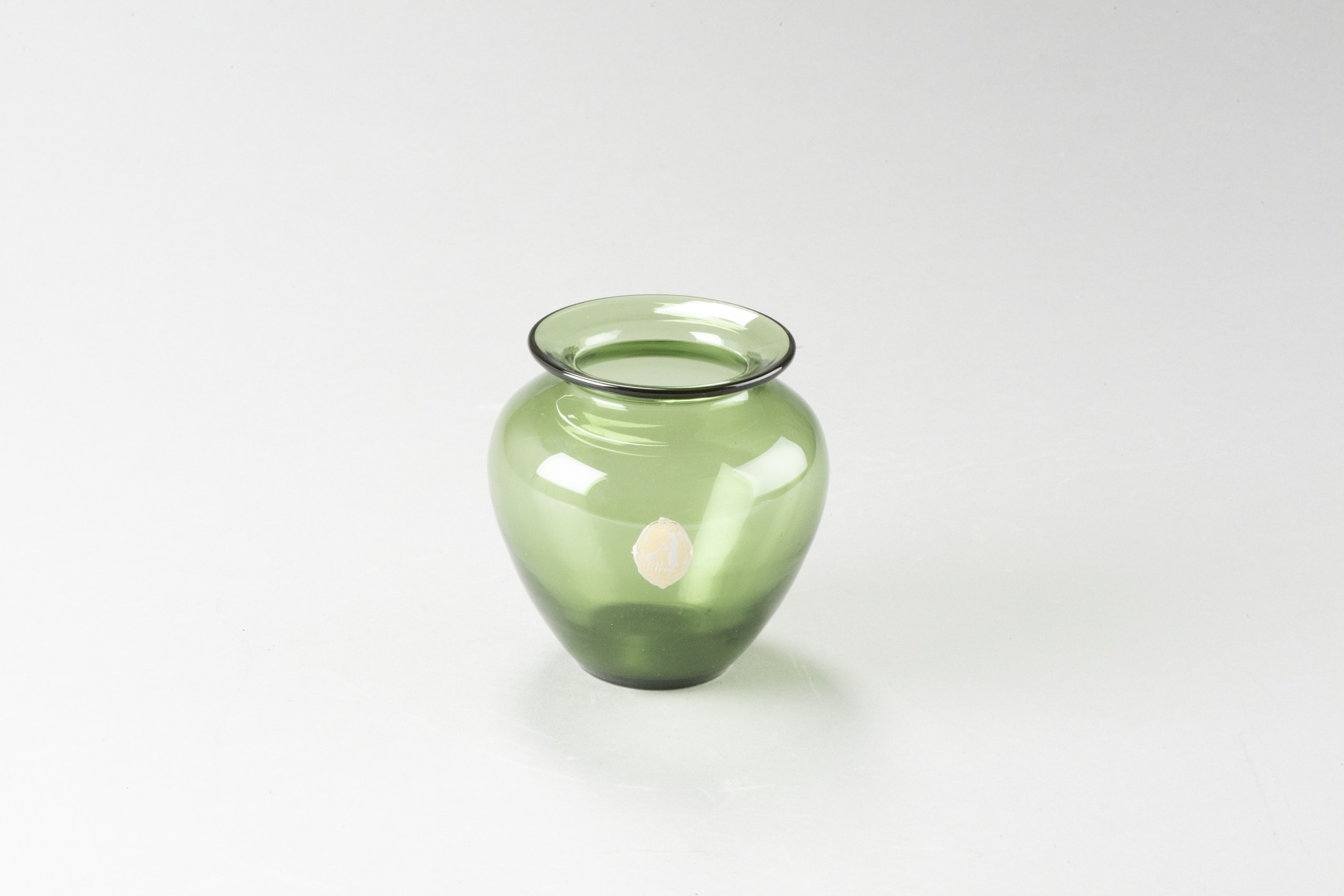 Le vase présenté ici est en verre vert. Lorsque les pièces en verre vert ne présentaient pas d'impuretés ou de défauts de fabrication, elles pouvaient être vendues telles quelles. Sinon, elles servaient de base pour la fabrication de vases émaillés.