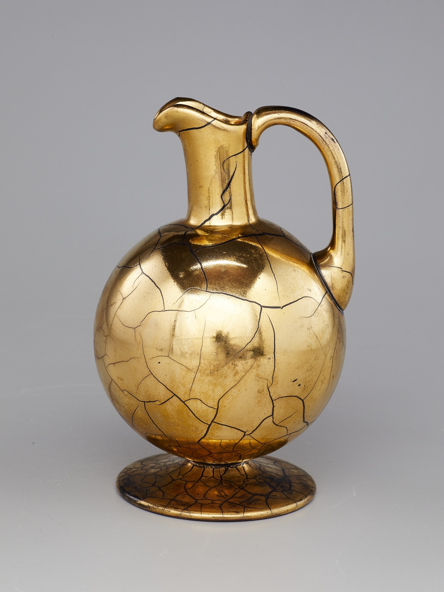 Verre vert soufflé en moule, col droit, bec verseur, pied et anse appliqués; revêtement émaillé bleu puis doré, les craquelures irrégulières apparaissant lors de la cuisson qui fixe le décor; forme: panse sphérique