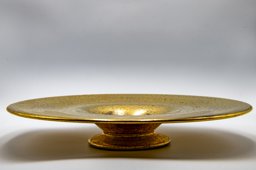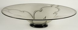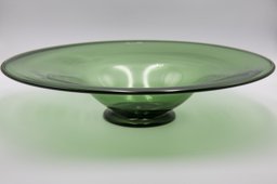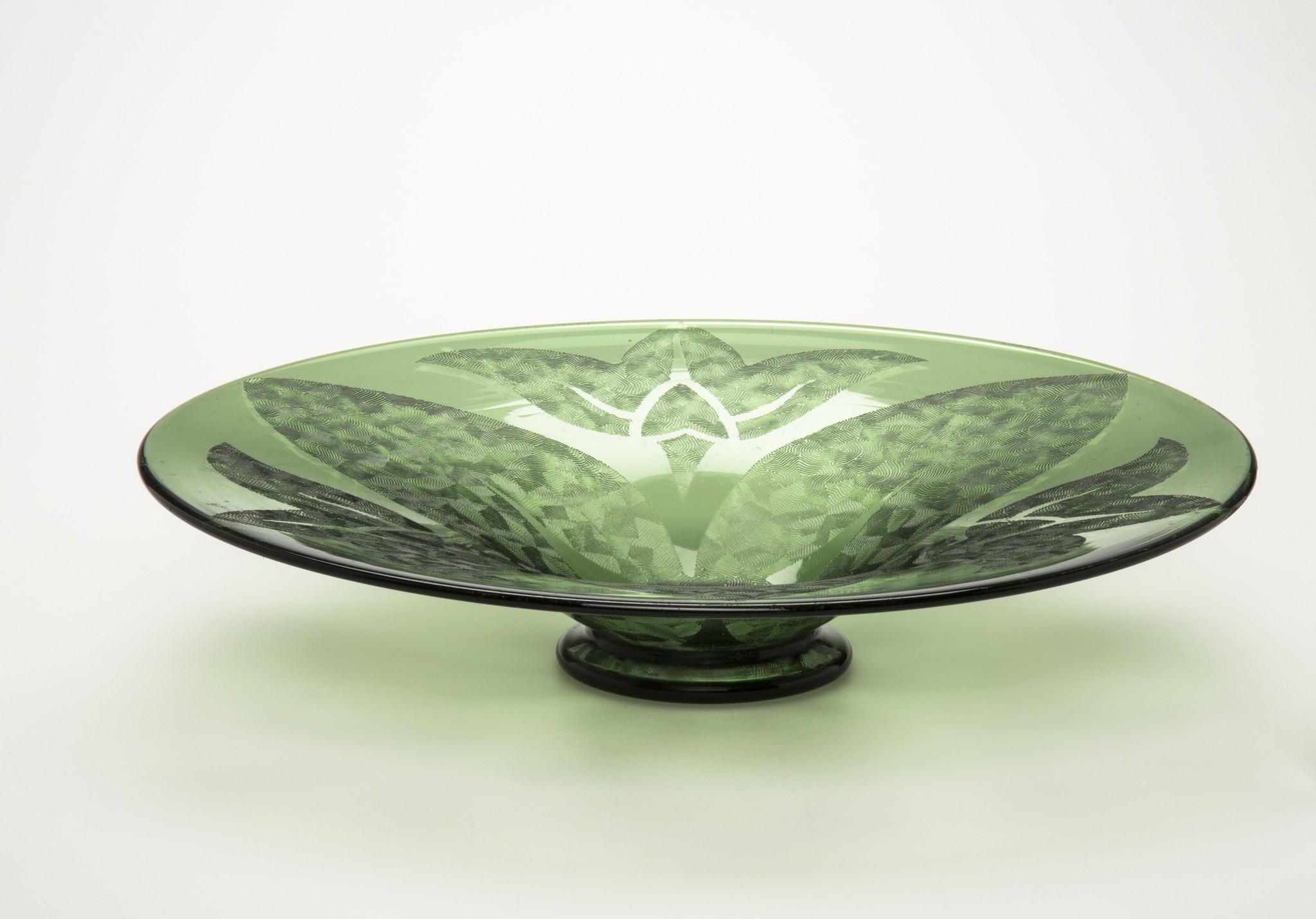 Ce modèle de coupe (134) fut créé à une période précoce de la Verrerie artistique (1930-1964). Les sources dont nous disposons sont des catalogues de la Verrerie de St-Prex, certains inédits, tels que les albums noirs munis de photographies de vases, vraisemblablement utilisés par les représentants de 1931 à 1935, où il est référencé comme coupe en verre vert, soit gravée à l’acide, soit unie. (Verreries de St-Prex, 1931). Ce modèle fait également partie de l’offre du premier catalogue de vente imprimé de 1935 (Verreries de St-Prex, 1935, 7), où il est présenté en verre vert.