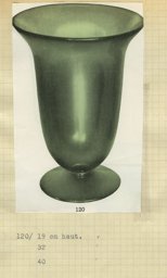 Ce modèle de vase (120) fut créé à une période précoce de la Verrerie artistique (1930-1964). Les sources dont nous disposons sont des catalogues de la Verrerie de St-Prex, certains inédits, tels que les albums noirs munis de photographies de vases, vraisemblablement utilisés par les représentants de 1931 à 1935, où ce modèle porte le no 185. Il est disponible en verre vert, émaillé noir, rouge et argenté craquelé, ou givré noir et blanc (Verreries de St-Prex, 1931, H 19). Ce modèle fait également partie de l’offre du premier catalogue de vente imprimé de 1935 (Verreries de St-Prex, 1935, 3, 12, 13 et 16), où il est présenté en verre vert ou en version or lustré, émaillé rouge brillant ou noir. Il figure ensuite dans un répertoire non publié, qui, basé sur les numéros d’inventaire des catalogues de 1935 à 1960, dresse la liste de tous les modèles de la production artistique (Verreries de St-Prex, 1964, H 19, 32 et 40 cm). Dès 1951, il est fabriqué en 19 cm uniquement (Verreries de St-Prex, 1951). D’après les sources, ce modèle a été ainsi élaboré dès 1931 et produit jusqu’en 1964.