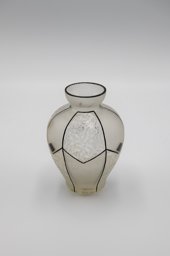 Le vase présenté ici ne figure plus dans le catalogue de 1935. Comme le confirme la signature, ce n’est pas seulement le modèle, mais également l’exemplaire lui-même qui peut être daté aux alentours de 1931. Par ailleurs, le décor géométrique noir, tracé sur des champs givrés qui alternent avec d'autres qui sont sablés, s'inscrit dans la période Art déco et rappelle les créations du Wiener Werkstätte vers 1915.