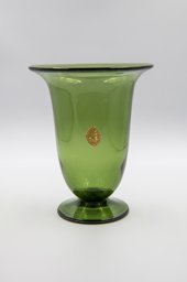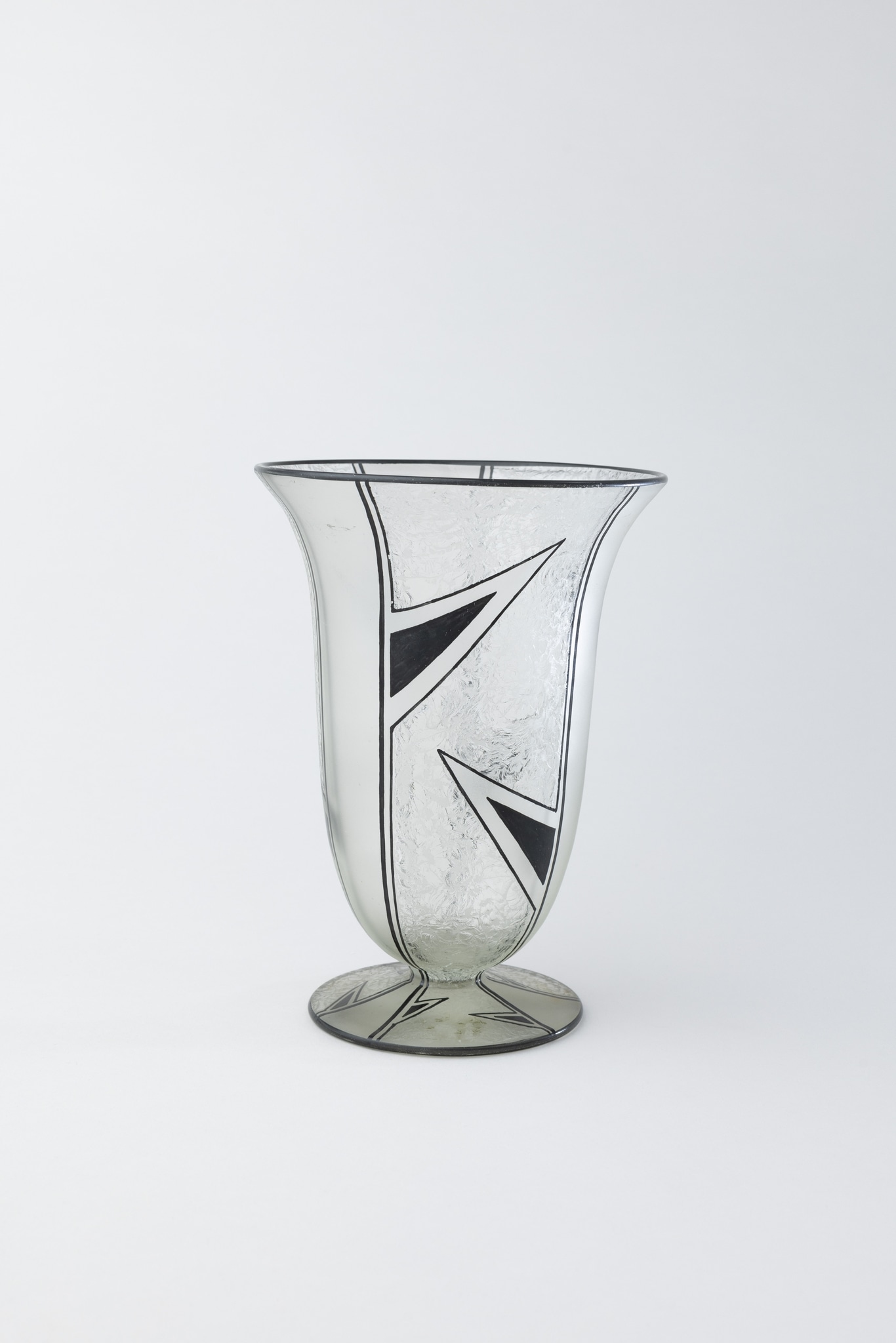 Verre incolore soufflé en moule, lèvre évasée, pied appliqué, décor: alternance de champs sablés et givrés à l'acide, motifs géométriques émaillés noir; forme: balustre