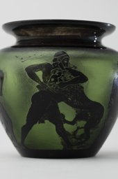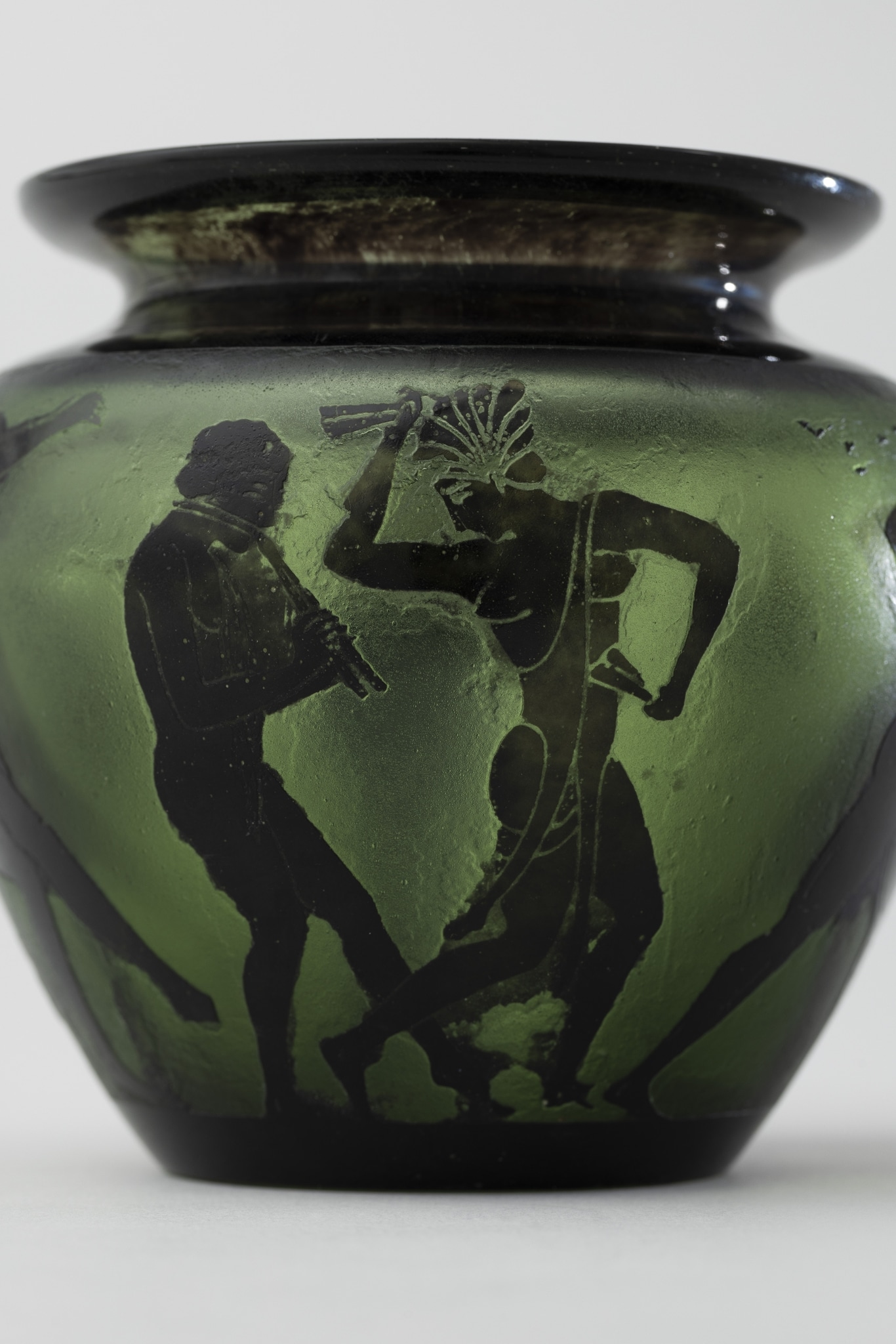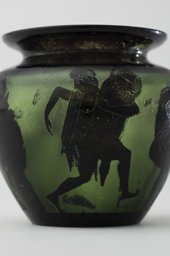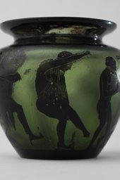 Verre vert, doublé noir, soufflé en moule, lèvre évasée; revêtement gravé à l'acide; forme: panse tronconique