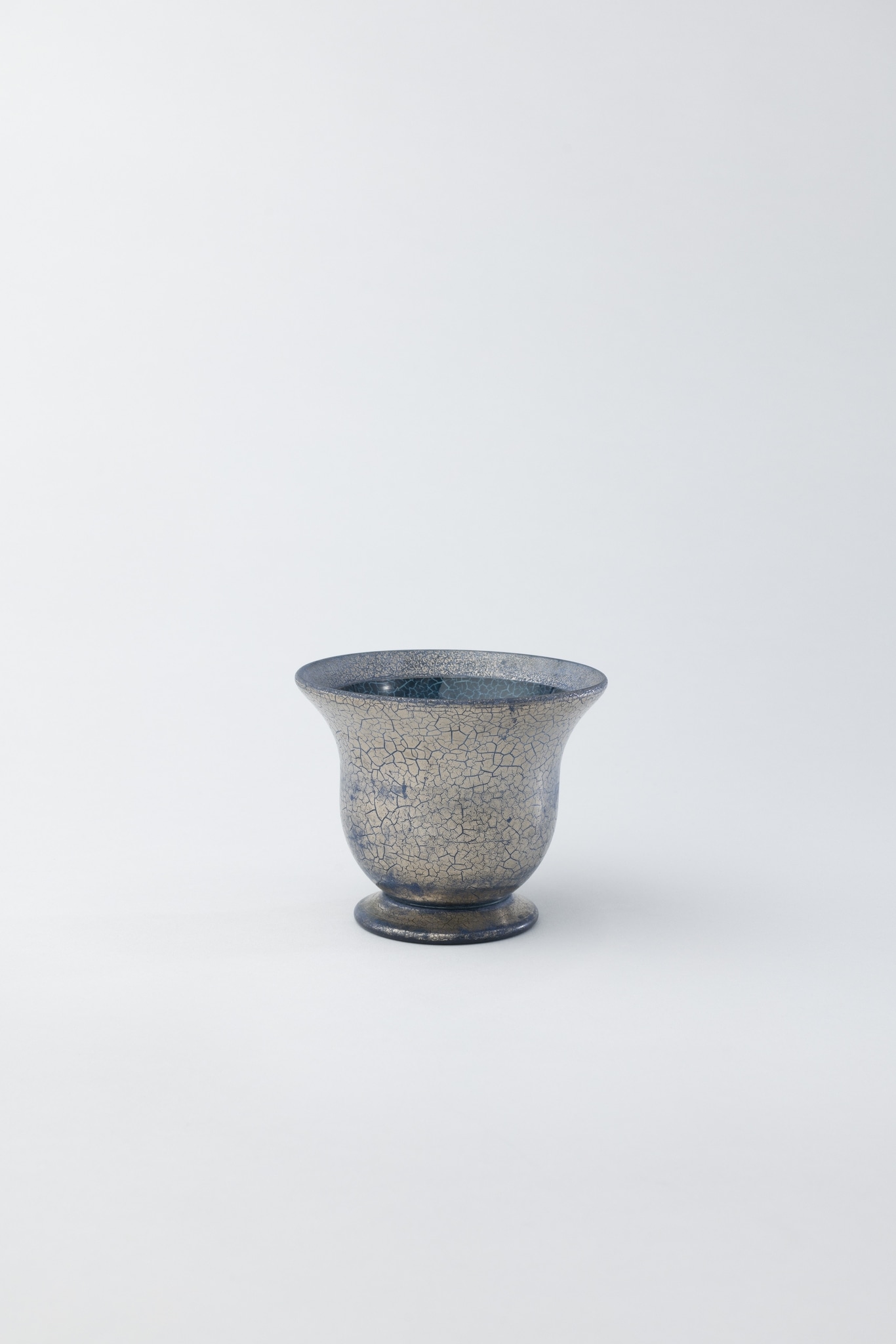Verre vert soufflé en moule, pied appliqué à chaud, lèvre évasée, revêtement posé à l'aérographe émaillé bleu, puis argent qui se craquelle à la recuisson; forme: balustre