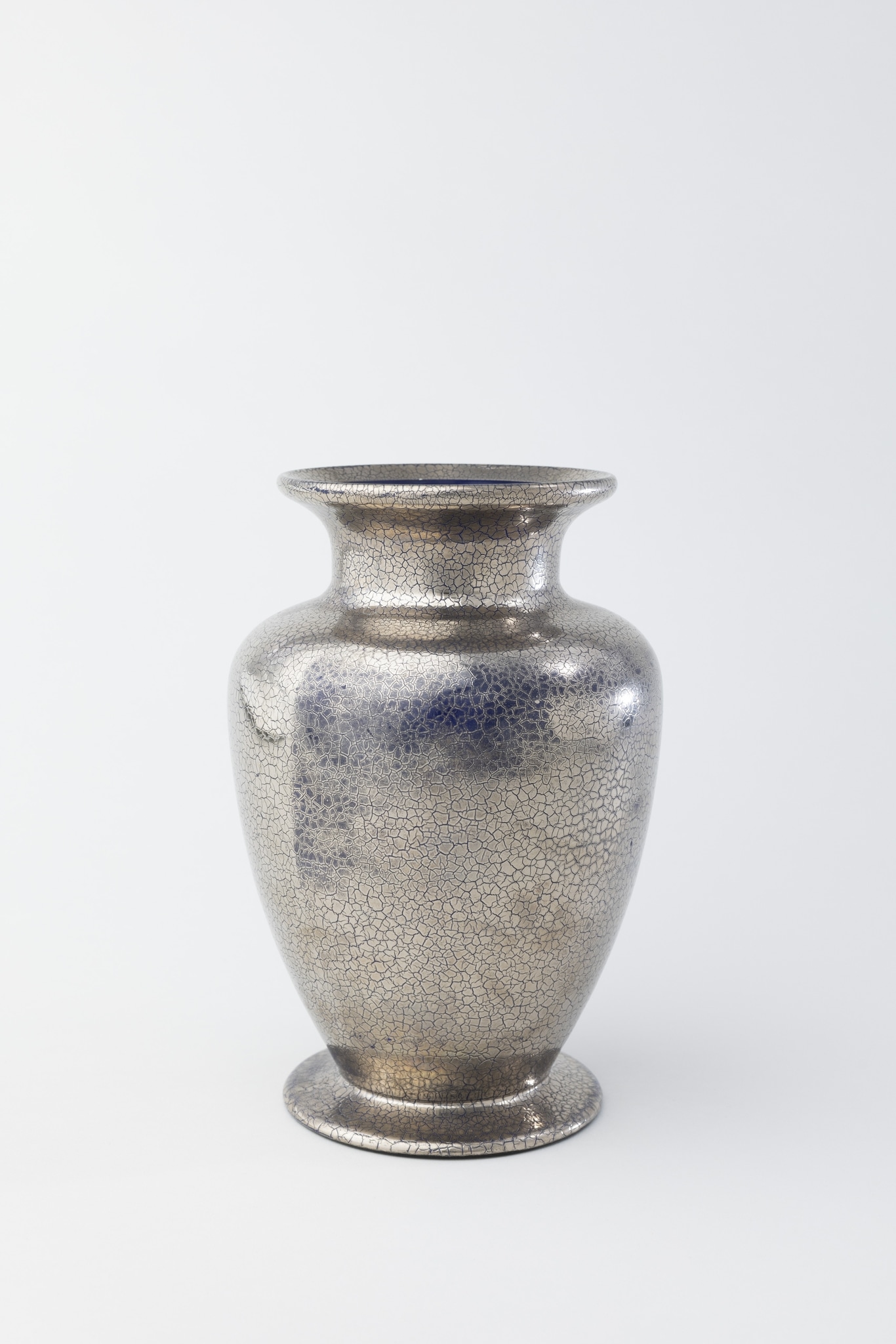 Le revêtement argenté craquelé du vase proposé ici est en usage dès 1931. Selon la liste de prix de 1951, ce dernier est alors remplacé par un nouveau revêtement dénommé «platine» (Walther, 2025, 65). Notre vase a donc été réalisé entre 1937 et 1951.