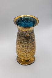 Verre vert, soufflé en moule, pied appliqué, lèvre évasée; revêtement émaillé bleu puis or, les craquelures apparaissent lors de la cuisson qui fixe le décor; forme: balustre