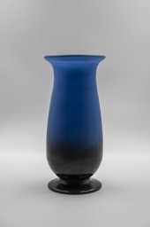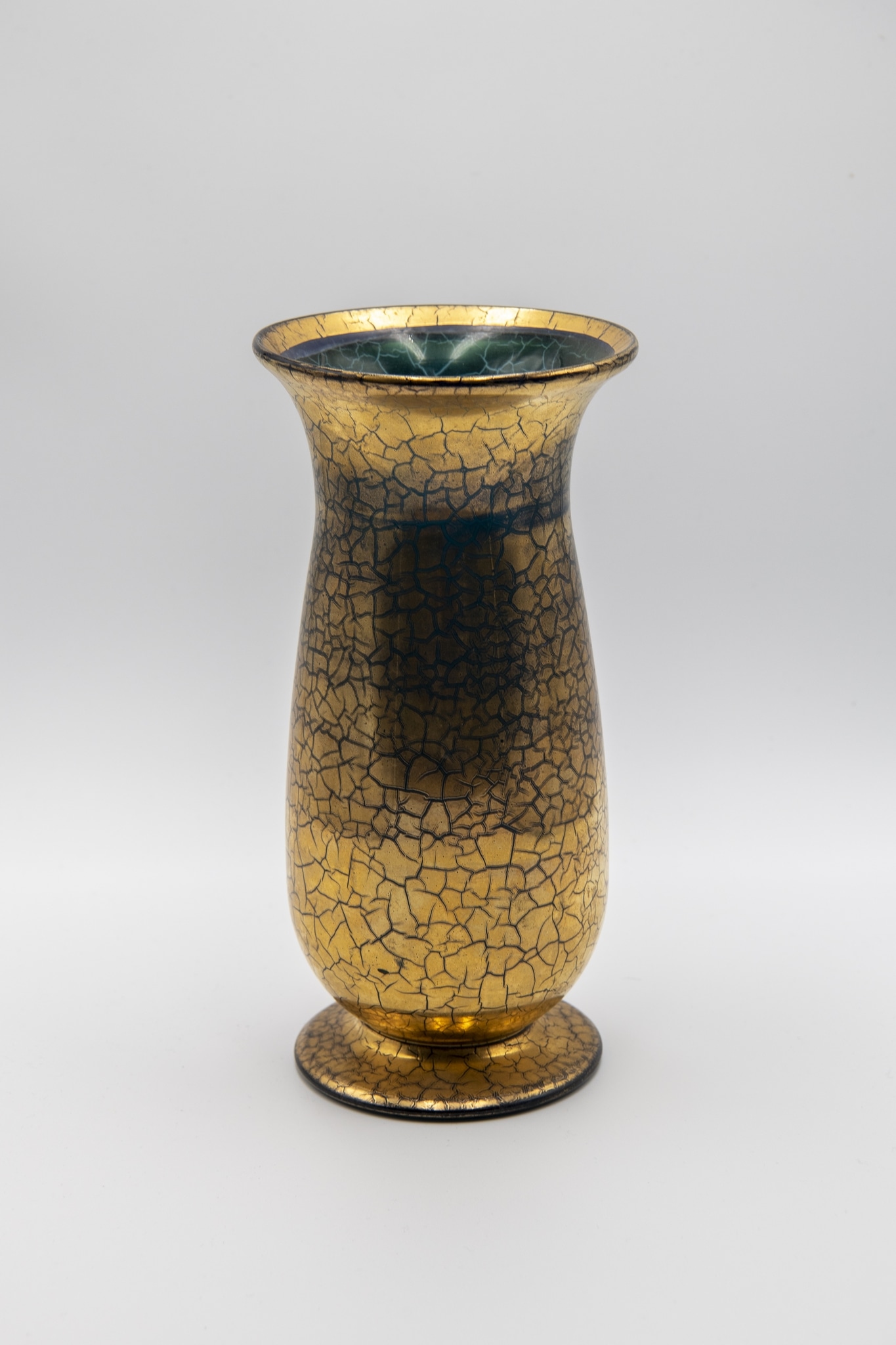 Le décor doré craquelé du vase présenté ici est emblématique de la Verrerie artistique, son apparition coïncidant avec la publication du catalogue de 1935. Serré et peu brillant, il est typique d'une pièce réalisée avec l'émail bleu disponible jusqu’en 1942 (Walther, 2025, 65).