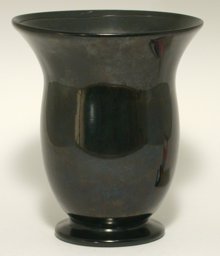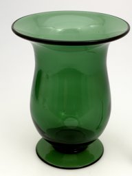 Ce modèle de vase (130) fut créé à une période précoce de la Verrerie artistique (1930-1964). Les sources dont nous disposons sont des catalogues de la Verrerie de St-Prex, certains inédits, tels que les albums noirs munis de photographies de vases, vraisemblablement utilisés par les représentants de 1931 à 1935, où ce modèle porte le no 118. Il est disponible en verre vert (H 14 à 27 cm), gravé à filet d’or (H 15 et 25 cm) ou givré recuit (H 16 et 18 cm) (Verreries de St-Prex, 1931). Ce modèle fait également partie de l’offre du premier catalogue de vente imprimé de 1935 (Verreries de St-Prex, 1935, 4, 14 et 16), où il est décliné en verre vert, argenté craquelé et émaillé noir.