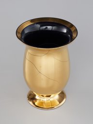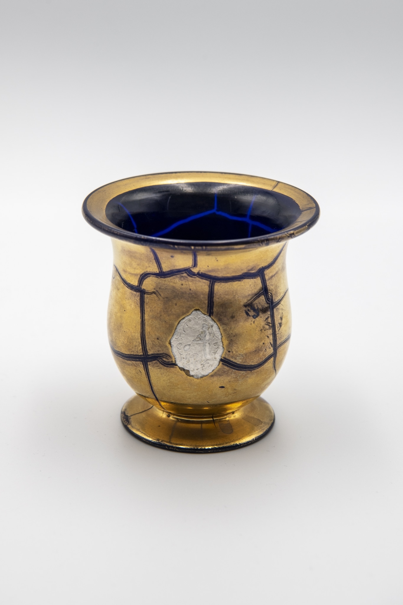Verre turquoise soufflé en moule, pied appliqué à chaud, lèvre évasée, revêtement émaillé bleu puis or, les craquelures apparaissant lors de la cuisson qui fixe le décor; forme: panse balustre,