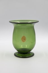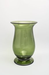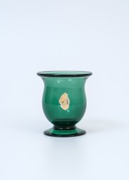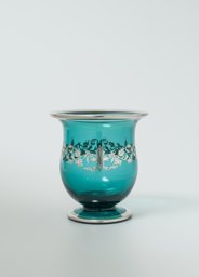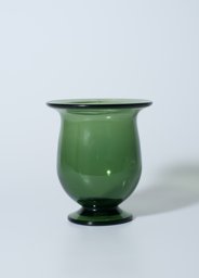 Verre vert soufflé en moule, travaillé à la pince, pied appliqué, revêtement émaillé noir posé à l'aérographe; forme: panse balustre sur pied, lèvre évasée