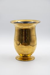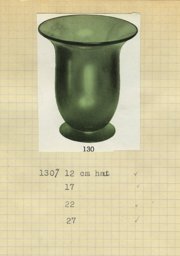 Ce modèle de vase (130) fut créé à une période précoce de la Verrerie artistique (1930-1964). Les sources dont nous disposons sont des catalogues de la Verrerie de St-Prex, certains inédits, tels que les albums noirs munis de photographies de vases, vraisemblablement utilisés par les représentants de 1931 à 1935, où ce modèle porte le no 118. Il est disponible en verre vert (H 14 à 27 cm), gravé à filet d’or (H 15 et 25 cm) ou givré recuit (H 16 et 18 cm) (Verreries de St-Prex, 1931). Ce modèle fait également partie de l’offre du premier catalogue de vente imprimé de 1935 (Verreries de St-Prex, 1935, 4, 14 et 16), où il est décliné en verre vert, argenté craquelé et émaillé noir.