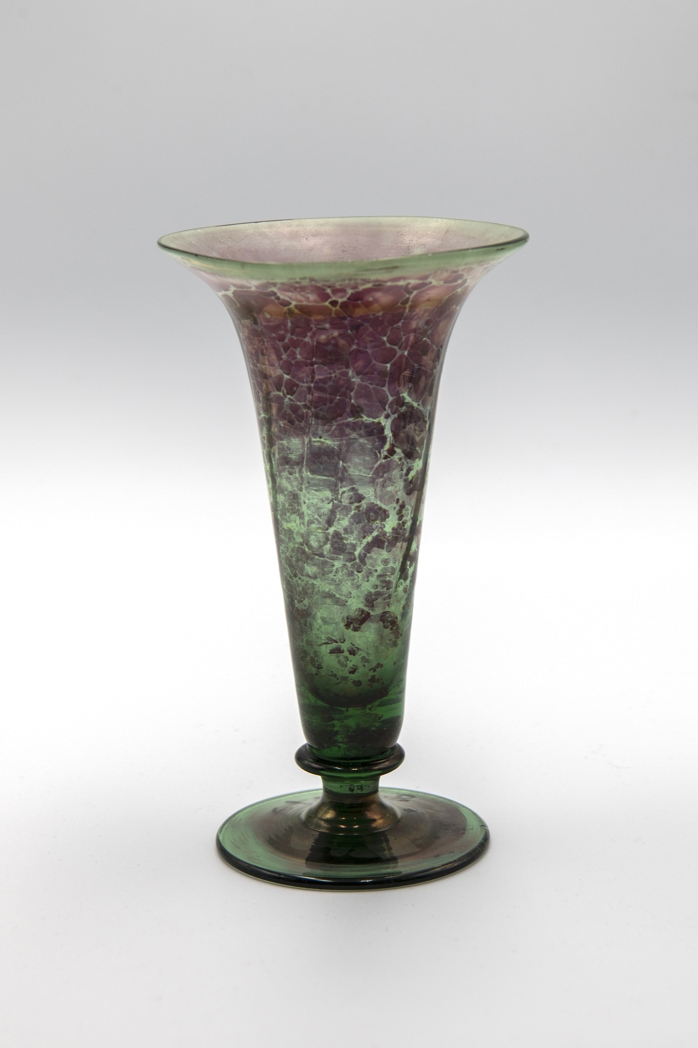 Ce modèle de vase en forme de flûte fut créé à une période précoce de la Verrerie artistique (1930-1964). La seule source dont nous disposons est une photo du stand de la Verrerie de St-Prex, prise au Comptoir suisse de 1931 (Greppin, 1931; Walther, 2025, Doc. 9, 35). Par la suite, cette flûte a été retirée de l’offre. La critique récente ne la mentionne pas.