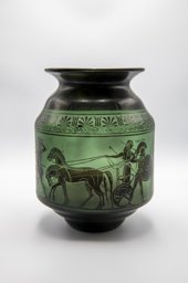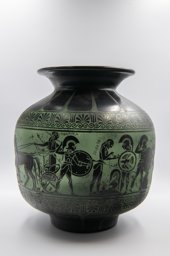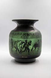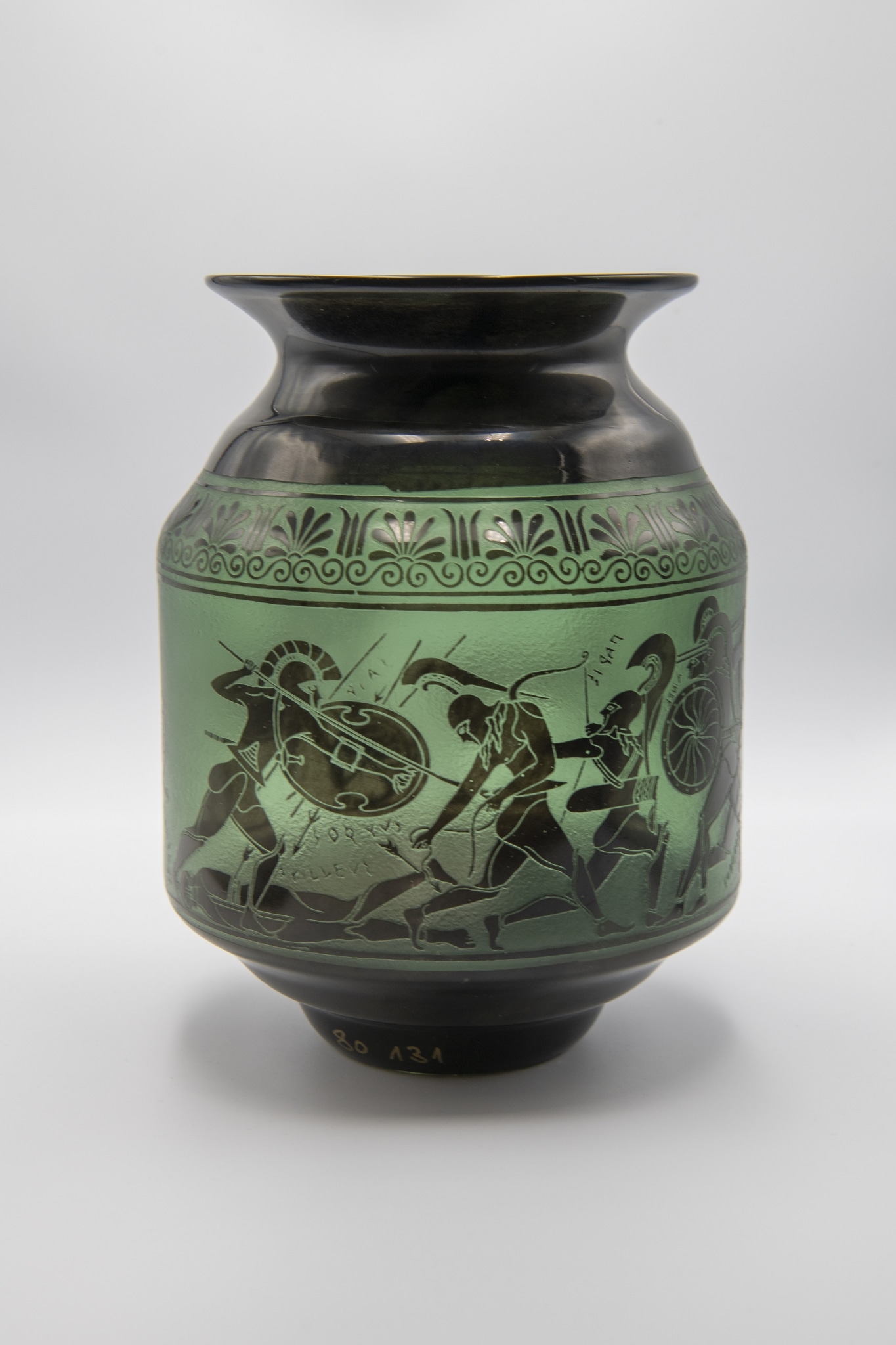 Le décor gravé à l'acide propose des scènes de la mort d'Achille. L’iconographie est fidèle au modèle d’un vase antique, publié en 1833, mais aujourd’hui perdu. Il s’agit du cinquième chant de l’Iliade d’Homère. Durant son stage au Vitrocentre Romont, Thibault Hugentobler a découvert la source iconographique (Belzik, 2018).
