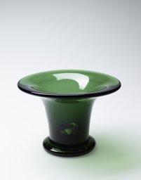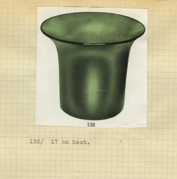 Ce modèle de vase (132) fut créé à une période précoce de la Verrerie artistique (1930-1964). Les sources dont nous disposons sont des catalogues de la Verrerie de St-Prex, certains inédits, tels que les albums noirs munis de photographies de vases, vraisemblablement utilisés par les représentants de 1931 à 1935, où ce modèle porte le no 18. Il est disponible avec anses (H 16-17 cm), en verre vert (Verreries de St-Prex, 1931). Ce modèle en verre vert fait également partie de l’offre du premier catalogue de vente imprimé de 1935 (Verreries de St-Prex, 1935, 4). Il figure ensuite dans un répertoire non publié, qui, basé sur les numéros d’inventaire des catalogues de 1935 à 1960, dresse la liste de tous les modèles de la production artistique (Verreries de St-Prex, 1964, H 17 cm). D’après les sources, ce modèle a été ainsi élaboré dès 1931 et produit jusqu’en 1964.