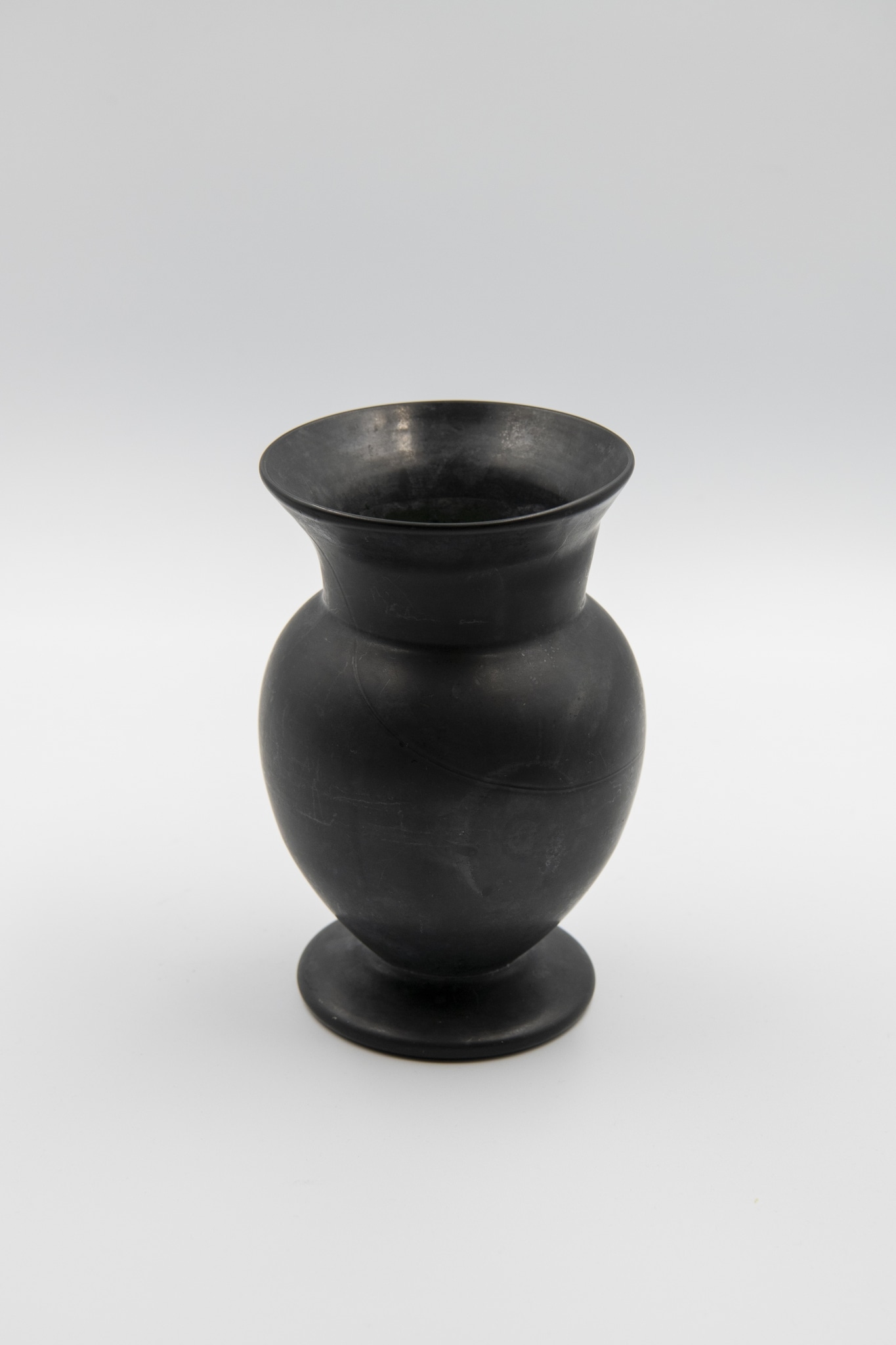 Sous la base, le vase proposé ici présente le timbre doré, gravé à l'acide, typique des 1931-1935. En outre, le revêtement émaillé noir faisait déjà partie du catalogue en usage avant 1935. Par ailleurs, l évoque les fameuses terres lustrées noires du céramiste Paul Ami Bonifas.