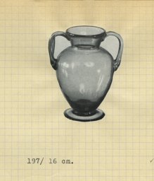 Ce modèle (197) de vase de la Verrerie artistique (1930-1964) a été commercialisé dès 1949. Les sources dont nous disposons sont des catalogues de la Verrerie de St-Prex, certains inédits. Il fait partie du "supplément" publié en 1949 (Verreries de St-Prex, 1949, 7), une offre disponible en verre vert, émaillé noir, rouge, bleu et or craquelé. Il figure enfin dans un répertoire non publié, qui, basé sur les numéros d’inventaire des catalogues de 1935 à 1960, dresse la liste de tous les modèles de la production artistique (Verreries de St-Prex, 1964, H 16 cm). D’après les sources, ce modèle est ainsi mis en vente en 1949 et produit jusqu’en 1964. Dans la critique récente, il est reproduit chez Dreyfus (Dreyfus, 1981, 13).