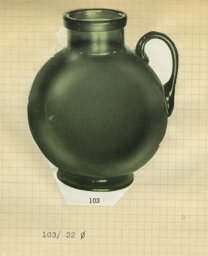 Ce modèle de vase (103) fut créé à une période précoce de la Verrerie artistique (1930-1964). Les sources dont nous disposons sont des catalogues de la Verrerie de St-Prex, certains inédits, tels que les albums noirs munis de photographies de vases, vraisemblablement utilisés par les représentants de 1931 à 1935. Le vase boule y figure comme no 9, 164 et 172, avec et sans anse (Verreries de St-Prex, 1931, D 15, 18, 20 cm). Il est proposé en verre vert, émaillé rouge, noir et bleu, ou en argenté craquelé. Ce modèle fait également partie de l’offre du premier catalogue de vente imprimé de 1935 (Verreries de St-Prex, 1935, 6), où il est proposé en verre vert. Dans un répertoire non publié, qui est basé sur les numéros d’inventaire des catalogues de 1935 à 1960 et qui dresse la liste de tous les modèles de la production artistique (Verreries de St-Prex, 1964), ce vase boule est présenté en quatre variantes, selon le diamètre et la présence d’une anse : le no 100 (sans anses) et le no 101 (avec anses) pour un diamètre de 10, 12, 14 et 16 cm, puis le no 102 (sans anses) et le no 103 (avec anse) pour un diamètre de 22 cm. On peut encore relever que la lampe boule (modèle 176) est identique au modèle 100, mais que le col a fait place au dispositif électrique. Dans le catalogue de 1960 (Verreries de St-Prex, 1960), les vases boules ne sont plus proposés. D’après les sources citées, ce modèle a été élaboré dès 1931. La critique récente ne le mentionne pas. En revanche, le céramiste Paul Ami Bonifas consacre un article à la "verrerie" en 1933, où quatre vases boules réalisés à Saint-Prex en 1931 illustrent son propos (Bonifas, 1933, 16-17).