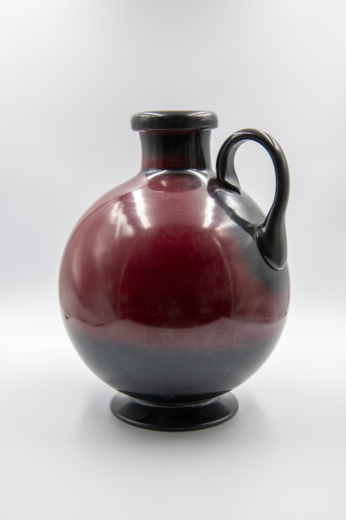 Sans le timbre doré des premières années, apposé sous le fond, le vase présenté ici a été réalisé après 1935. Par ailleurs, la anse est posée sur le corps du vase et ne relie pas ce dernier au col, comme c'est le cas des modèles d'avant 1935. Pour garantir une production la plus efficace possible du revêtement, les pièces sont d’abord émaillées en noir. Dans un second temps, la seconde couleur, le rouge ou le bleu, était appliquée de manière spontanée. Ainsi, bien que produite de manière semi-industrielle, chaque pièce est unique.