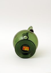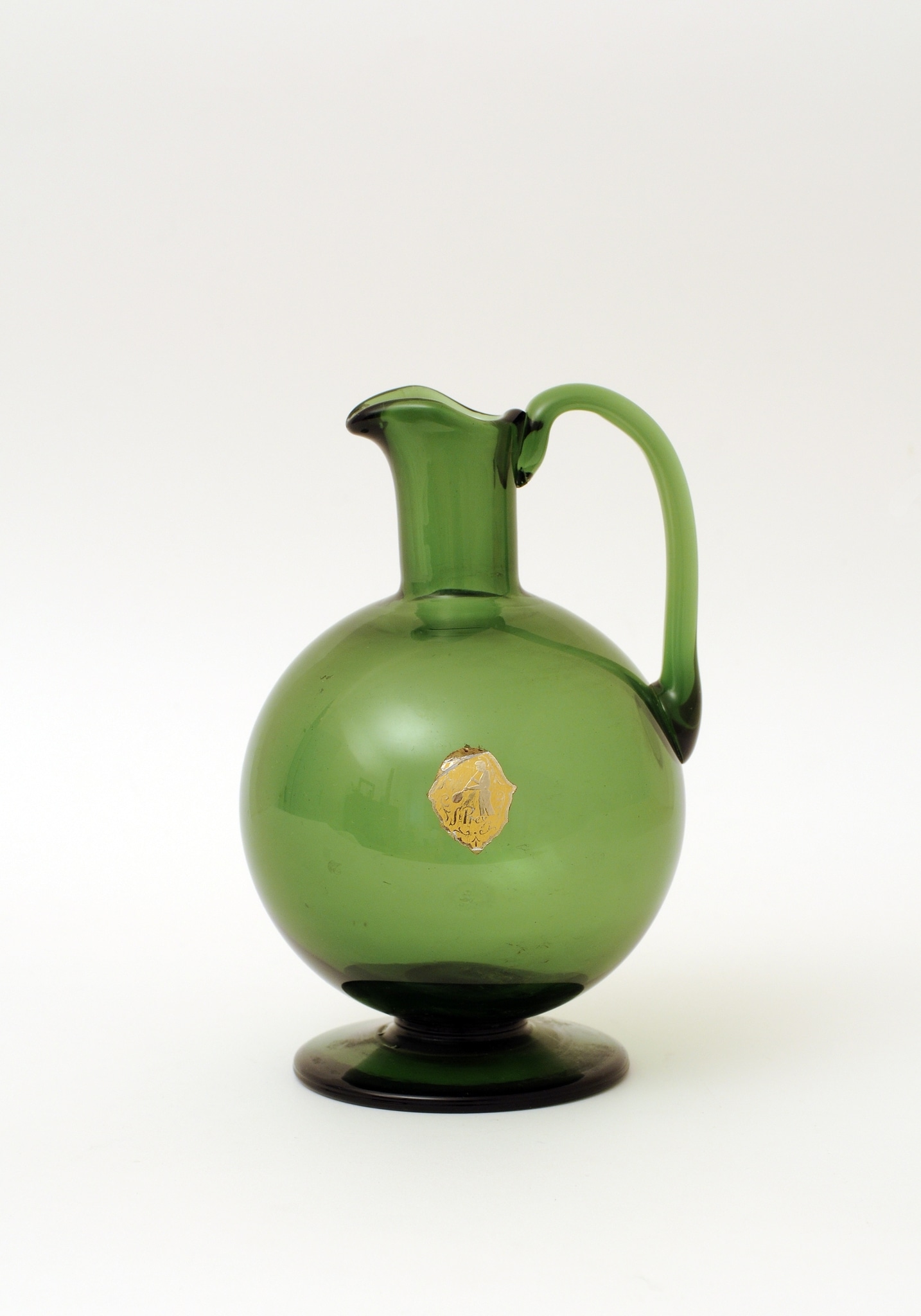 La cruche présentée ici est en verre vert, sans décor supplémentaire. Lorsque les pièces en verre vert ne présentaient ni impuretés ni défauts de fabrication, elles étaient commercialisées telles quelles. Sinon, elles servaient de base à la réalisation de modèles émaillés.