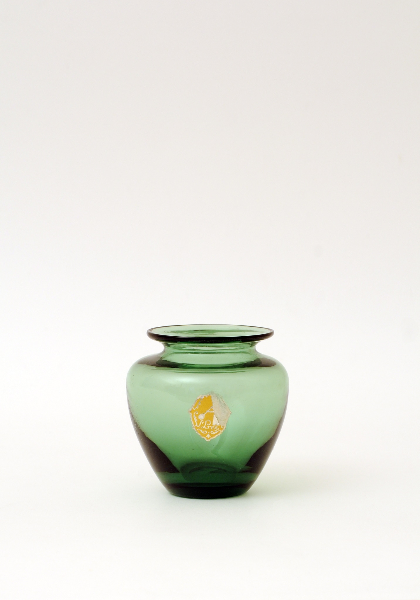 Le vase présenté ici est en verre vert. Lorsque les pièces en verre vert ne présentaient pas d'impuretés ou de défauts de fabrication, elles pouvaient être vendues telles quelles. Sinon, elles servaient de base pour la fabrication de vases émaillés.