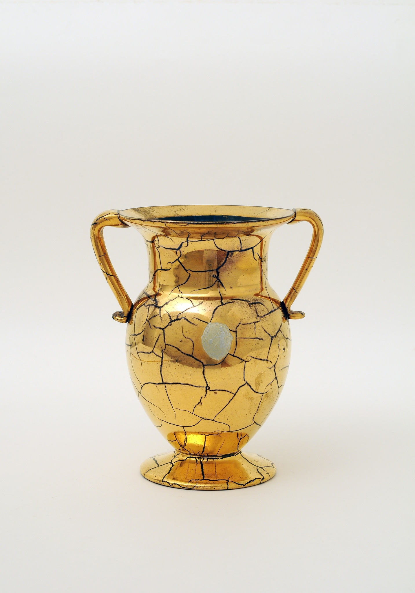 Verre transparent turquoise, soufflé en moule, anses (avec petit retour à la pince) et pied appliqués, revêtement émaillé bleu, recouvert de dorure. Les craquelures irrégulières apparaissent lors de la recuisson qui fixe le décor; forme: panse ovoïde
