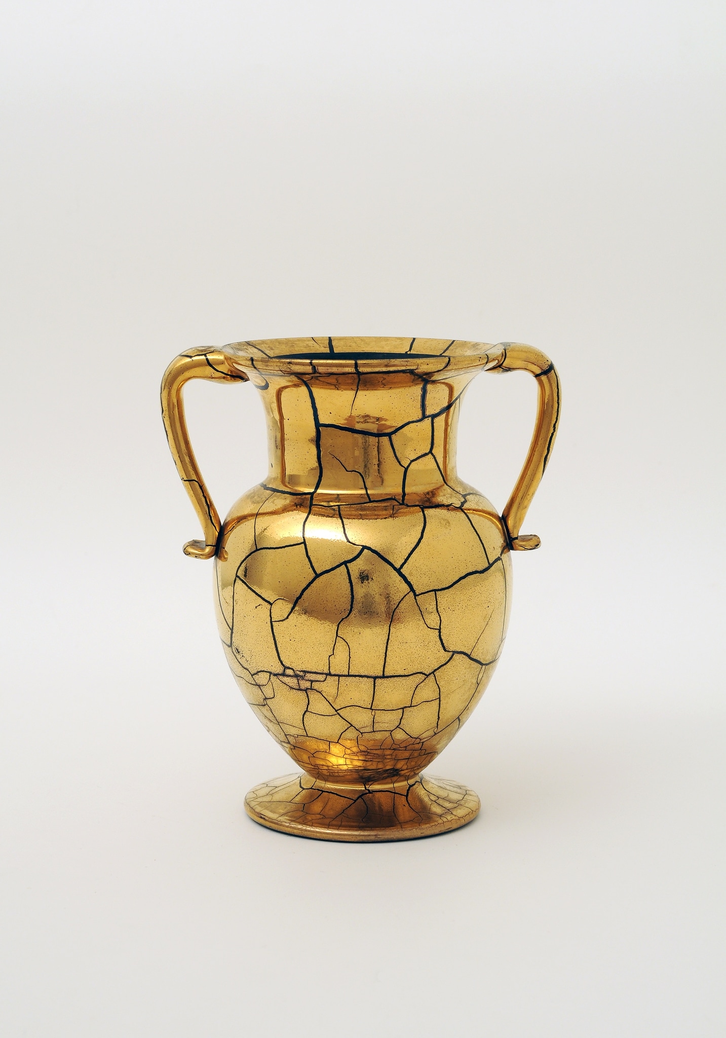 Verre transparent turquoise, soufflé en moule, anses (avec petit retour à la pince) et pied appliqués, revêtement émaillé bleu, recouvert de dorure. Les craquelures irrégulières apparaissent lors de la recuisson qui fixe le décor; forme: panse ovoïde