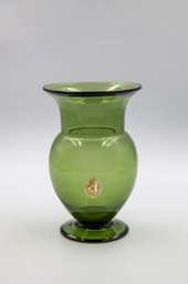 Sans le timbre doré des premières années ou d’autres particularités, rien ne suggère une production du vase en verre vert présenté ici avant 1935. Lorsque les pièces en verre vert ne présentaient ni impuretés ni défauts de fabrication, elles étaient commercialisées telles quelles. Sinon, elles servaient de base à la réalisation de vases émaillés.
