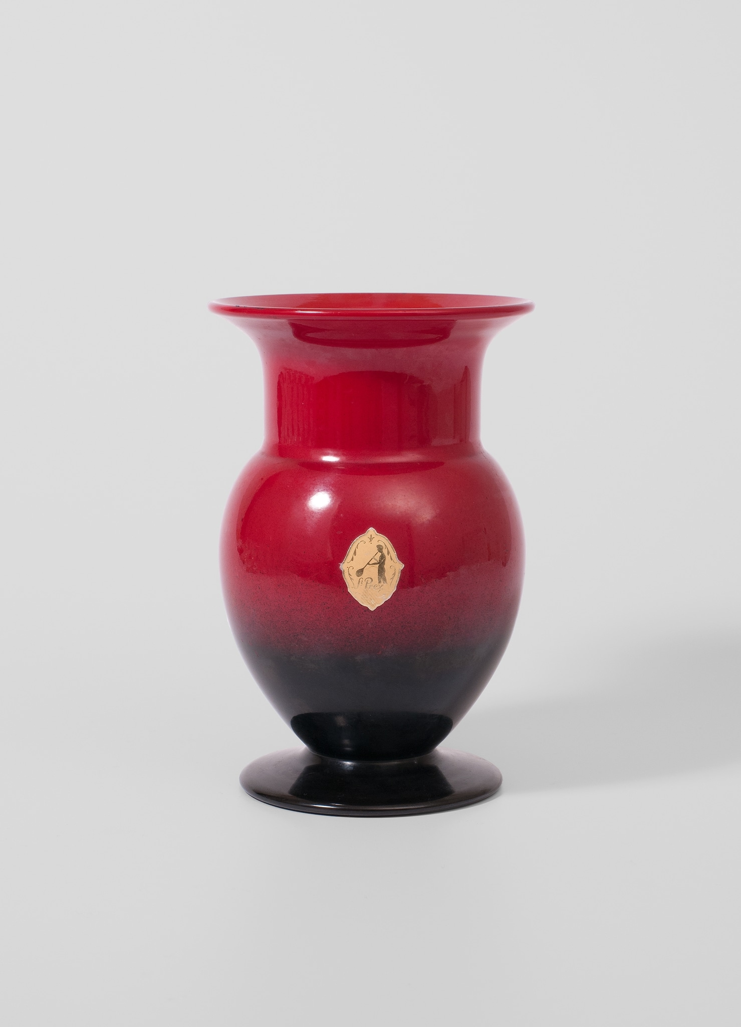 Sans le timbre doré des premières années ou d’autres particularités, rien ne suggère une production du vase présenté ici avant 1935. En revanche, il est muni de l'étiquette dorée introduite en 1935. Le vase proposé ici a été émaillé en noir et rouge. Pour garantir une production la plus efficace possible, les pièces sont d’abord émaillées en noir. Dans un second temps, la seconde couleur, le rouge ou le bleu, était appliquée de manière spontanée. Ainsi, bien que produite de manière semi-industrielle, chaque pièce est unique.