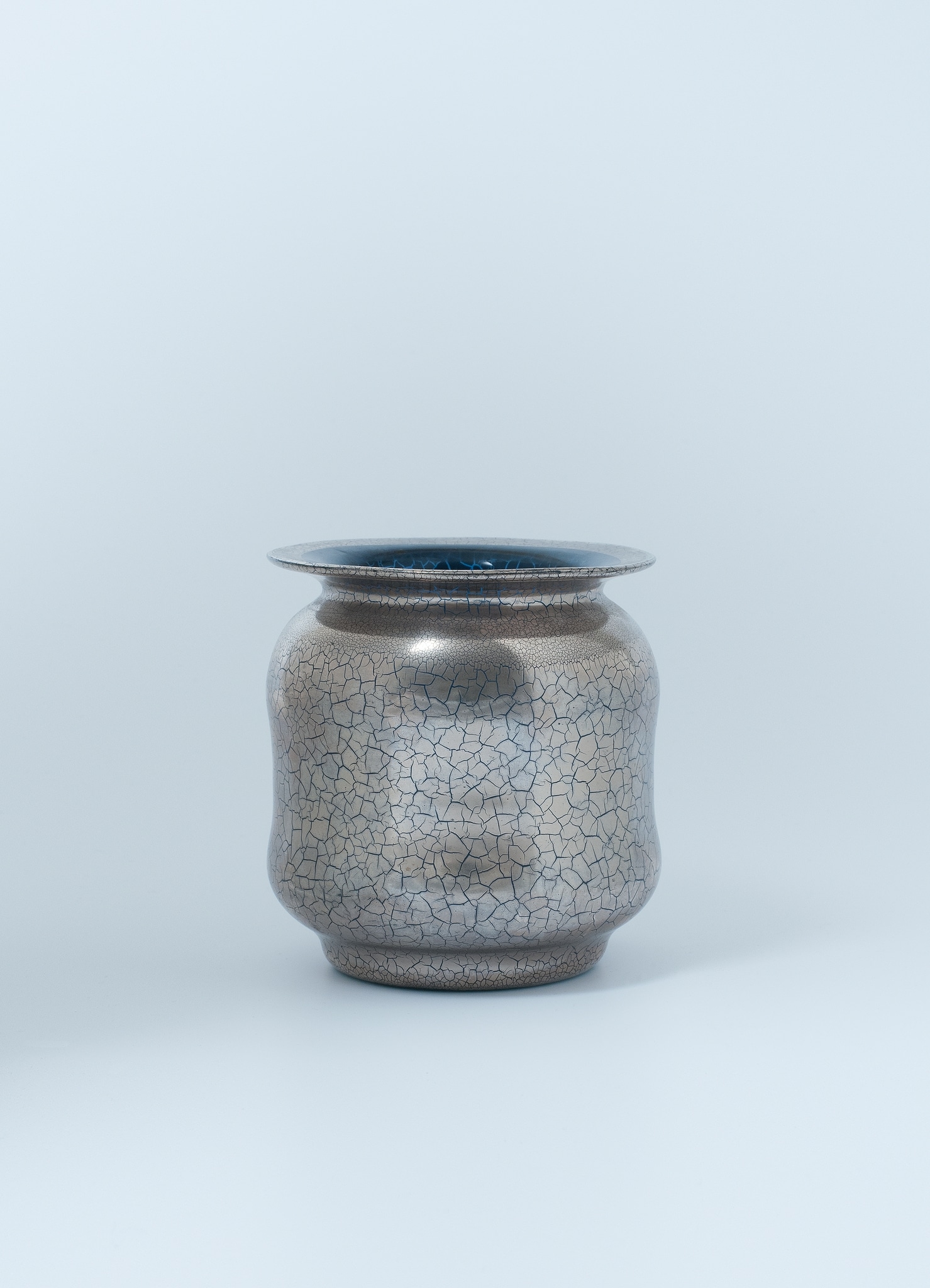 Verre vert, soufflé en moule, lèvre évasée, revêtement émaillé bleu, puis argent, le craquelé apparaît lors de la cuisson qui fixe le décor; forme: légèrement concave