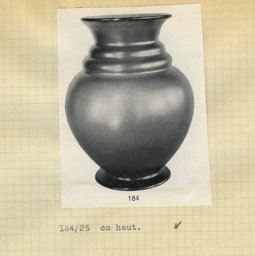Ce modèle (184) de vase de la Verrerie artistique (1930-1964) a été commercialisé dès 1937. Les sources dont nous disposons sont des catalogues de la Verrerie de St-Prex, certains inédits. Il fait partie de l’offre des "Nouveautés", publiée en 1937 (Verreries de St-Prex, 1937, H 25 cm), qui est disponible en verre vert (VV), émaillé en noir, rouge-brillant et rouge-mat (N, RB et RM), en bleu-brillant et bleu-mat (BB et BM), en argenté lustré et craquelé (AL et AC), et finalement en or bordé, lustré ou craquelé (OB, OL et OC). Il figure finalement dans un répertoire non publié, qui est basé sur les numéros d’inventaire des catalogues de 1935 à 1960 et qui dresse la liste de tous les modèles de la production artistique (Verreries de St-Prex, 1964, H 25cm). D’après les sources, ce modèle est ainsi mis en vente dès 1937 et produit jusqu’en 1964. Dreyfus est le seul qui le retient dans la littérature secondaire (Dreyfus, 1981, 14).