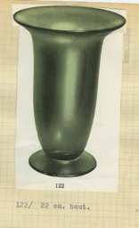 Ce modèle de vase (122) fut créé à une période précoce de la Verrerie artistique (1930-1964). Les sources dont nous disposons sont des catalogues de la Verrerie de St-Prex, certains inédits, tels que les albums noirs munis de photographies de vases, vraisemblablement utilisés par les représentants de 1931 à 1935, où ce modèle porte le no 185. Il est disponible en verre vert, émaillé rouge, bleu et noir et argenté craquelé (Verreries de St-Prex, 1931; H 19 et 24 cm). Ce modèle fait également partie de l’offre du premier catalogue de vente imprimé de 1935 (Verreries de St-Prex, 1935, 3, 14 et 15) où il est présenté en verre vert ou en version argent lustré ou or craquelé. Il figure ensuite dans un répertoire non publié, qui, basé sur les numéros d’inventaire des catalogues de 1935 à 1960, dresse la liste de tous les modèles de la production artistique (Verreries de St-Prex, 1964, H 19 et 24 cm). Le catalogue de 1951 l’offre en version de 22 cm (Verreries de St-Prex, 1951) et celui de 1960, de 12 cm (Verreries de St-Prex, 1960). D’après les sources, ce modèle a ainsi été élaboré dès 1931 et produit jusqu’en 1964.