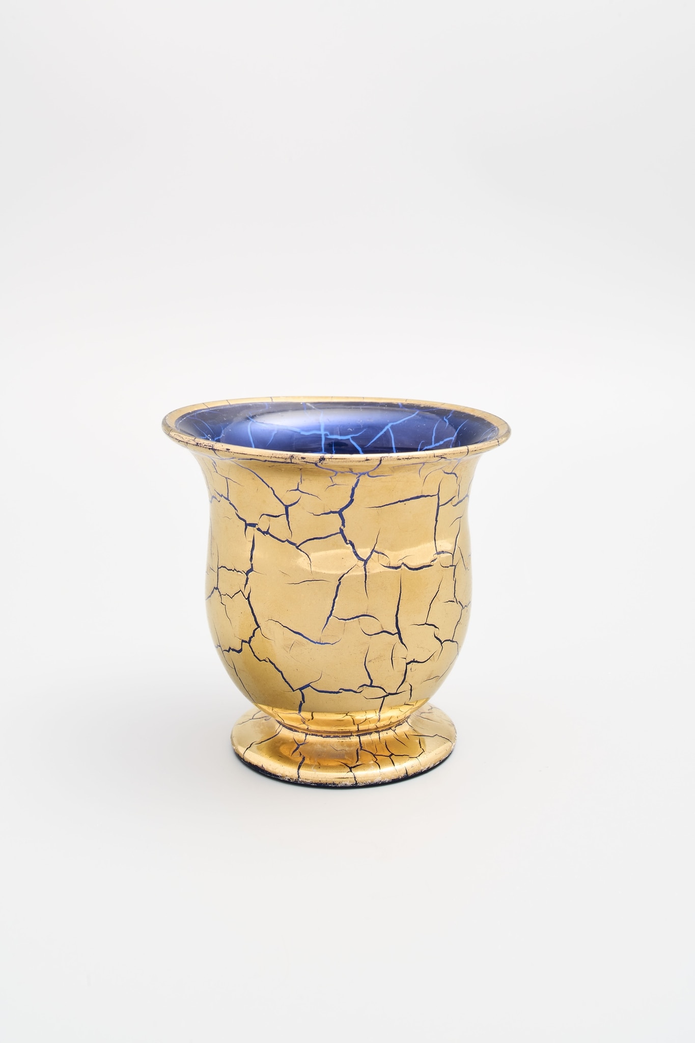 Verre incolore soufflé en moule, lèvre évasée, revêtement d'émail bleu posé à l'aérographe, puis recouvert de dorure, les craquelures apparaissant à la cuisson qui fixe le décor; forme: panse balustre