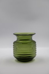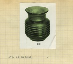 Ce modèle de vase (140) fut créé à une période précoce de la Verrerie artistique (1930-1964). Les sources dont nous disposons sont des catalogues de la Verrerie de St-Prex, certains inédits, tels que les albums noirs munis de photographies de vases, vraisemblablement utilisés par les représentants de 1931 à 1935, où ce modèle émaillé noir porte le no 186 F (Verreries de St-Prex, 1931, H 12 cm). Ce modèle fait également partie de l’offre du premier catalogue de vente imprimé de 1935 (Verreries de St-Prex, 1935, 2, 12 et 13), où il est décliné en verre vert, or bordé et rouge brillant. Il figure ensuite dans un répertoire non publié, qui, basé sur les numéros d’inventaire des catalogues de 1935 à 1960, dresse la liste de tous les modèles de la production artistique (Verreries de St-Prex, 1964, H 13 cm). La Verrerie de Saint-Prex est présente au Comptoir suisse de Lausanne dès 1930. Les photographies du stand représentent une source précieuse. Sur celle de 1933, ce modèle apparaît pour la première fois (GOP, 1933). Produit jusqu’en 1964, il est probable qu'il ait été créé vers 1933.